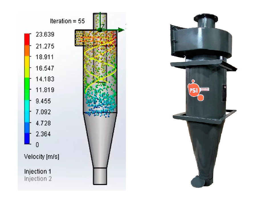 A força centrífuga criada pelos ciclones e multiciclones faz com que as partículas se choquem contra as paredes do equipamento, isto provoca redução na sua velocidade e queda das mesmas pelo cone inferior do equipamento enquanto o ar limpo sai pela parte superior.