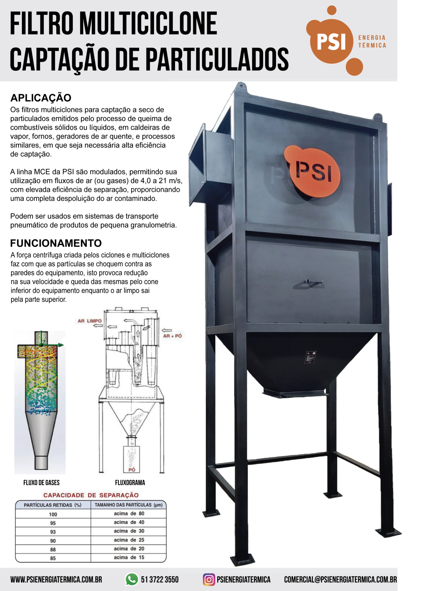 Os filtros multiciclones modelo MCE PSI são modulados, permitindo sua utilização em fluxos de ar (ou gases) de 4,0 a 21 m/s, para captação a seco de particulados emitidos pelo processo de queima de combustíveis sólidos ou líquidos, em caldeiras de vapor/ fornos / geradores de ar quente, e processos similares, em que seja necessária alta eficiência de captação.